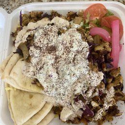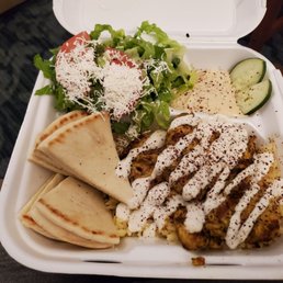 One of the standout dishes at Mediterranean Gyro Grill is the Chicken Shawarma, marinated strips of chicken slow-roasted in Middle Eastern style, served over rice with Tahini sauce and pita. The flavors are robust, the meat tender, and the combination of spices truly elevates the dish to a whole new level.